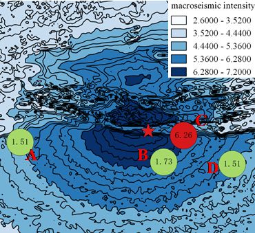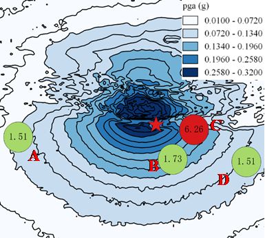 除了記錄地面運(yùn)動(dòng)峰值外,密布強(qiáng)震臺(tái)網(wǎng)還有一個(gè)非常重要的功能,就是可以獲得整個(gè)地震的時(shí)程記錄,進(jìn)而可以顯著提升震害評(píng)估的可靠性。地震破壞力和地面運(yùn)動(dòng)的幅值、持時(shí)和頻譜都有關(guān)系,簡(jiǎn)單的一個(gè)峰值難以準(zhǔn)確刻畫地面運(yùn)動(dòng)的破壞力。還是以圖4中的臺(tái)站A和臺(tái)站D為例,其記錄的加速度幅值都是1.51m/s/s,PAGER根據(jù)幅值給出的烈度分布如圖5所示,分別為5.2度和5.4度,也就是說,無論是根據(jù)儀器記錄的PGA,還是PAGER給出的烈度,這兩個(gè)臺(tái)站的破壞力應(yīng)該差不多。