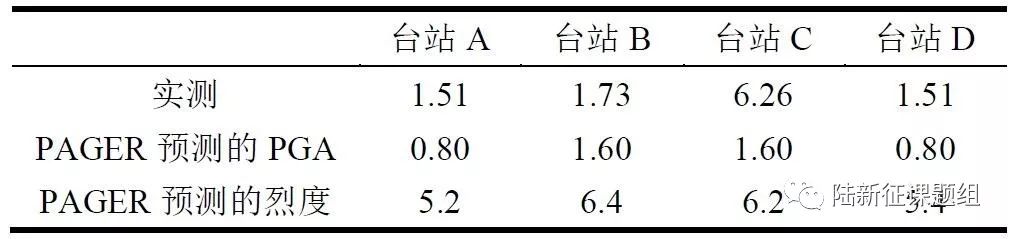 從圖2的對(duì)比可以看出,PAGER給出的地震動(dòng)強(qiáng)度和實(shí)測(cè)地震動(dòng)強(qiáng)度有較大的差別,選取近場(chǎng)4個(gè)典型臺(tái)站為例(參見圖4),PAGER給出的PGA與實(shí)測(cè)PGA對(duì)比如表1所示,可見二者差異顯著,甚至達(dá)到數(shù)倍。