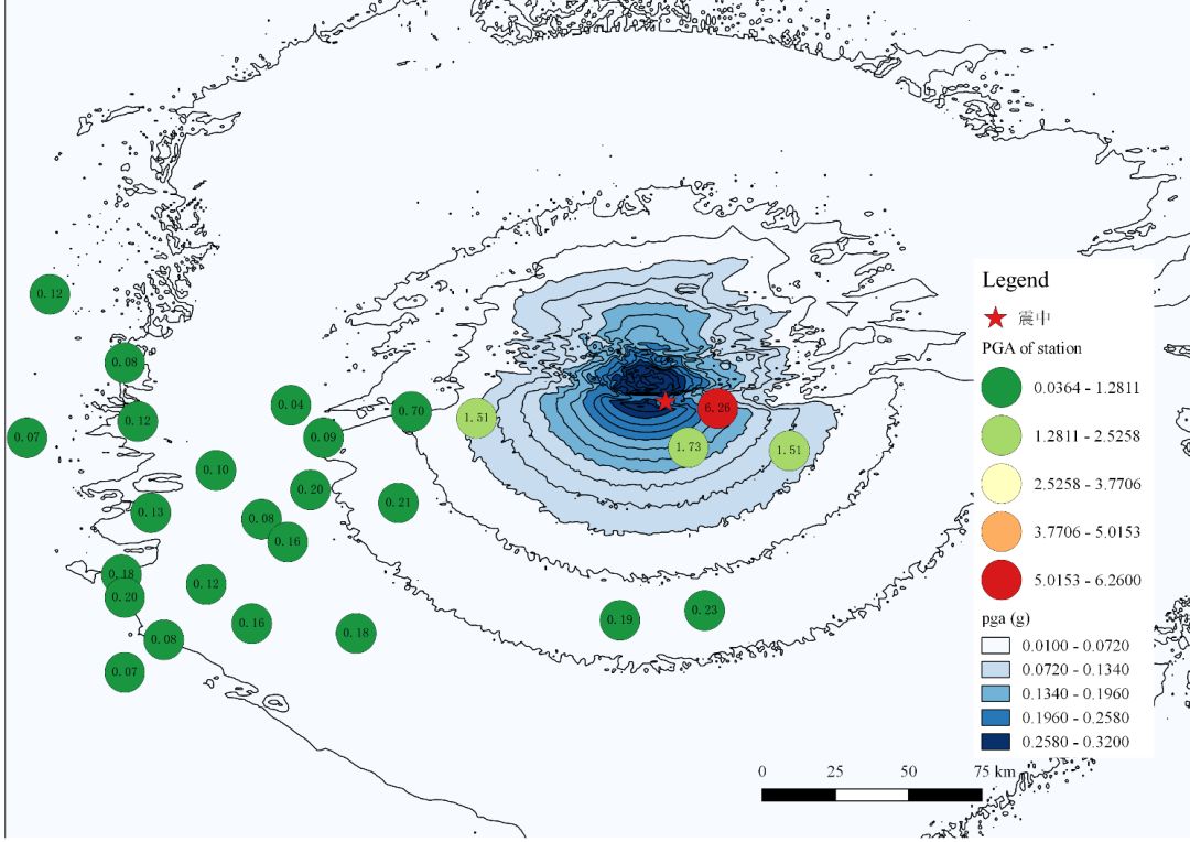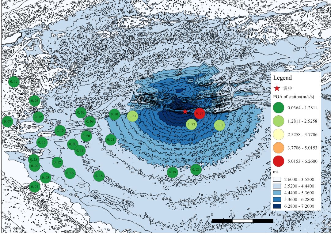 RED-ACT系統(tǒng)對(duì)本次地震的破壞力的分析結(jié)果如圖8所示。