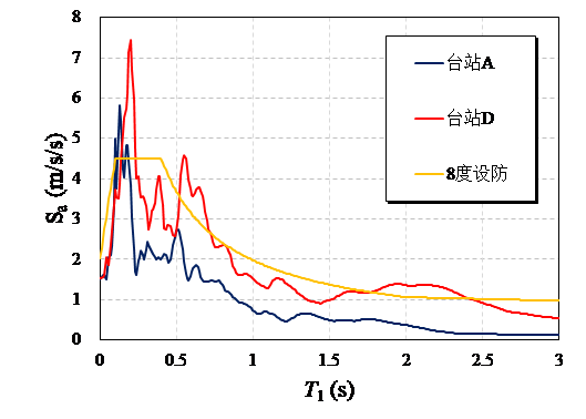 但是,如果我們把臺(tái)站A和臺(tái)站D的地面運(yùn)動(dòng)反應(yīng)譜畫出來,如圖6所示,則可以清楚的看出,臺(tái)站D的破壞能力要明顯強(qiáng)于臺(tái)站A。而無論是根據(jù)儀器記錄的PGA,還是根據(jù)PAGER給出的烈度分布,都難以準(zhǔn)確區(qū)分這一重要差異。