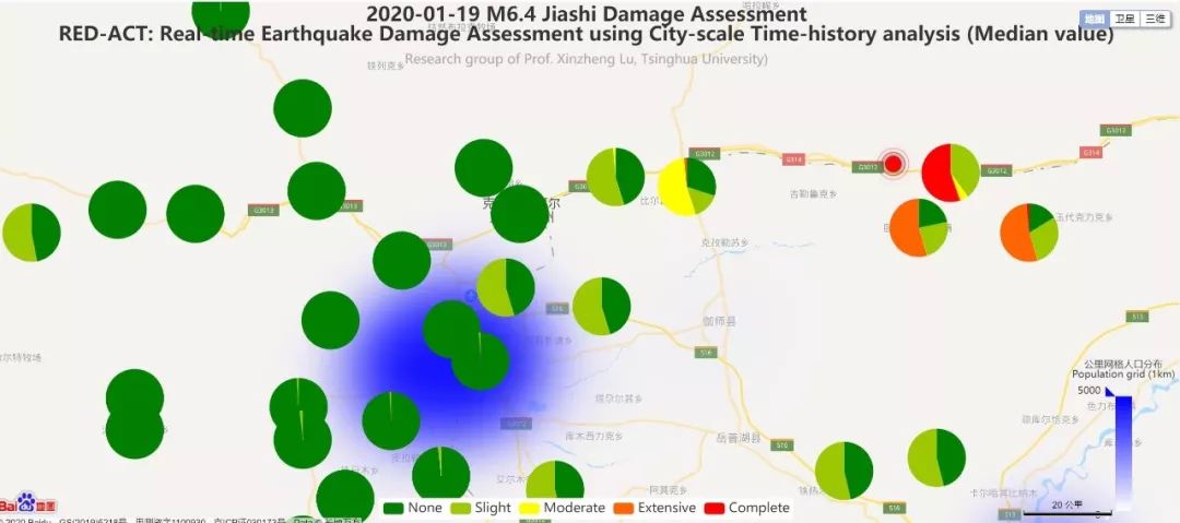 RED-ACT分析結(jié)果表明雖然震中附近房屋破壞較為嚴(yán)重(圖8),但該區(qū)域人口密度較低(圖8中藍(lán)色底圖代表人口密度)。而人口密集區(qū)域地震破壞力較小,建筑最多只有輕度破壞,這與實(shí)際震害結(jié)果基本一致。