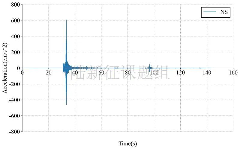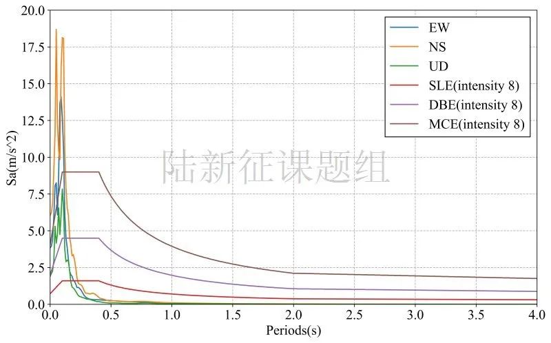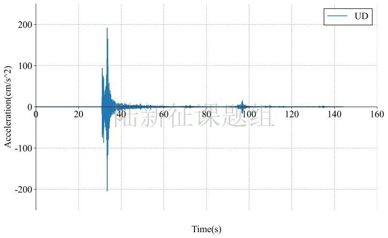 NP5230記錄臺站位置北緯33.57度,西經(jīng)116.51度(圖1,其中紅色標(biāo)記為震中位置),記錄到水平向地震動峰值加速度為604.9cm/s/s,豎直向地震動峰值加速度為204.4cm/s/s。該地震動及反應(yīng)譜如圖2、圖3所示。