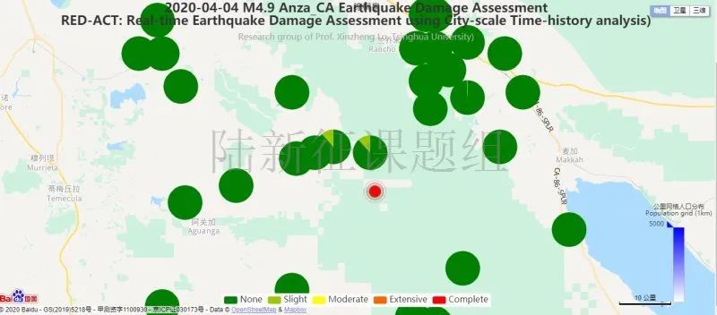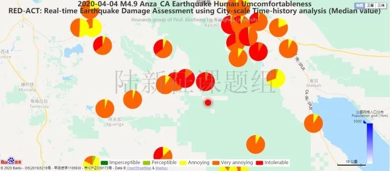利用密布強(qiáng)震臺網(wǎng)在震后獲取的實(shí)時(shí)地震動信息,再結(jié)合城市抗震彈塑性分析,就可以得到地震發(fā)生后不同地點(diǎn)的建筑破壞情況,為抗震救災(zāi)決策提供科學(xué)支撐。圖4為根據(jù)20200404美國加州安扎4.9級地震震中附近范圍內(nèi)臺站記錄分析得到的建筑震害分布示意圖。圖5為根據(jù)20200404美國加州安扎4.9級地震震中附近范圍內(nèi)臺站記錄分析得到的人員加速度感受分布示意圖。