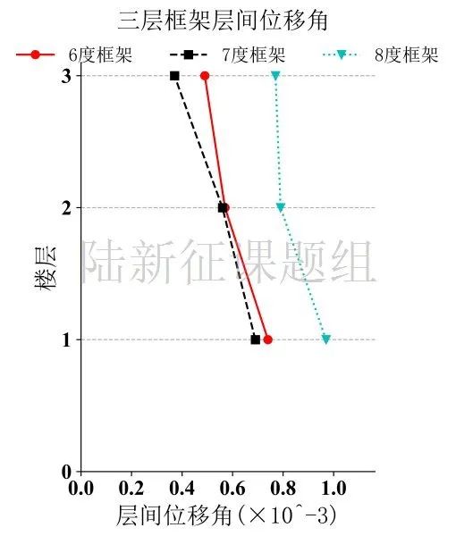 將NP5230臺站記錄輸入立面布置如圖6 (a)所示的6度、7度和8度設(shè)防的典型三層鋼筋混凝土框架結(jié)構(gòu),得到其層間位移角包絡(luò)如圖6 (b)所示。
