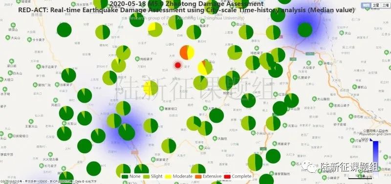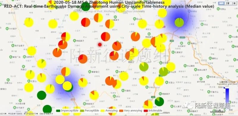 利用密布強(qiáng)震臺(tái)網(wǎng)在震后獲取的實(shí)時(shí)地震動(dòng)信息,再結(jié)合城市抗震彈塑性分析,就可以得到地震發(fā)生后不同地點(diǎn)的建筑破壞情況,為抗震救災(zāi)決策提供科學(xué)支撐。圖4為根據(jù)20200518云南昭通市巧家縣5.0級(jí)地震震中附近范圍內(nèi)臺(tái)站記錄分析得到的建筑震害分布示意圖。圖5為根據(jù)20200518云南昭通市巧家縣5.0級(jí)地震震中附近范圍內(nèi)臺(tái)站記錄分析得到的人員加速度感受分布示意圖。