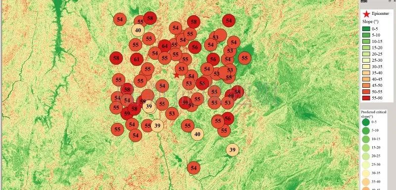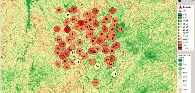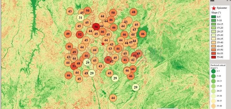 根據(jù)當(dāng)?shù)氐匦螖?shù)據(jù)、巖性數(shù)據(jù)和實(shí)測(cè)地面運(yùn)動(dòng)記錄,可以計(jì)算得到不同滑坡體飽和比例下的滑坡分布,如圖6所示。其中,底圖為當(dāng)?shù)仄露确植紙D,每個(gè)圓圈代表每個(gè)臺(tái)站的計(jì)算結(jié)果,圓圈中的數(shù)字代表發(fā)生滑坡的臨界坡度,臺(tái)站附近坡度大于該數(shù)值的地方滑坡發(fā)生概率高。