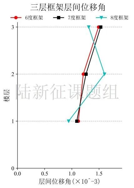將C2215臺(tái)站記錄輸入立面布置如圖7 (a)所示的6度、7度和8度設(shè)防的典型三層鋼筋混凝土框架結(jié)構(gòu),得到其層間位移角包絡(luò)如圖7 (b)所示。