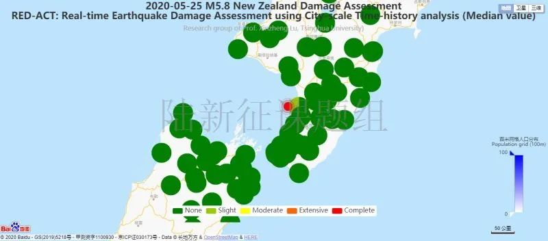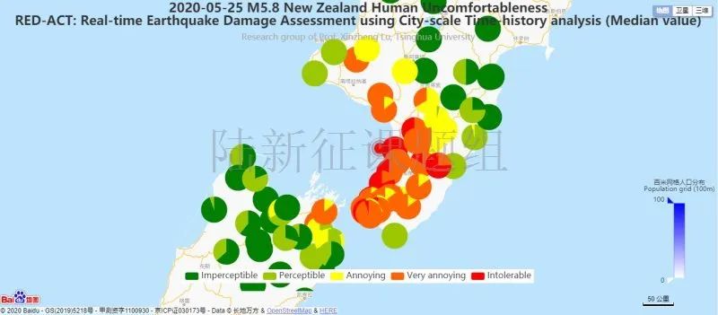 利用密布強(qiáng)震臺(tái)網(wǎng)在震后獲取的實(shí)時(shí)地震動(dòng)信息,再結(jié)合城市抗震彈塑性分析,就可以得到地震發(fā)生后不同地點(diǎn)的建筑破壞情況,為抗震救災(zāi)決策提供科學(xué)支撐。圖4為根據(jù)20200525新西蘭Levin5.8級地震震中附近范圍內(nèi)臺(tái)站記錄分析得到的建筑震害分布示意圖。圖5為根據(jù)20200525新西蘭Levin5.8級地震震中附近范圍內(nèi)臺(tái)站記錄分析得到的人員加速度感受分布示意圖。