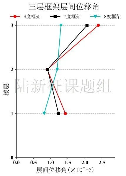 將FXBS臺(tái)站記錄輸入立面布置如圖6 (a)所示的6度、7度和8度設(shè)防的典型三層鋼筋混凝土框架結(jié)構(gòu),得到其層間位移角包絡(luò)如圖6 (b)所示。