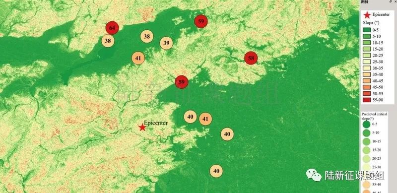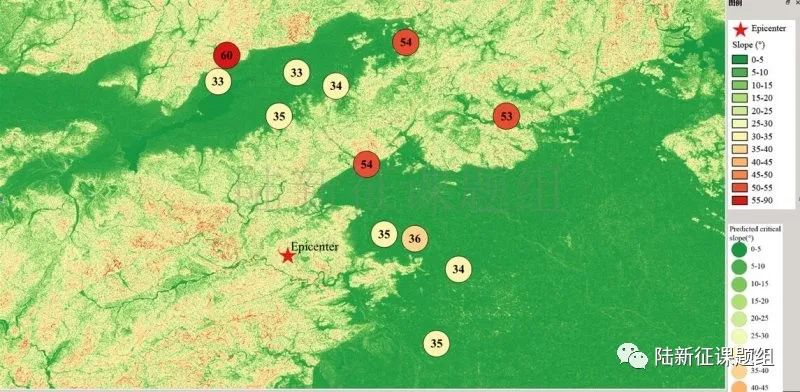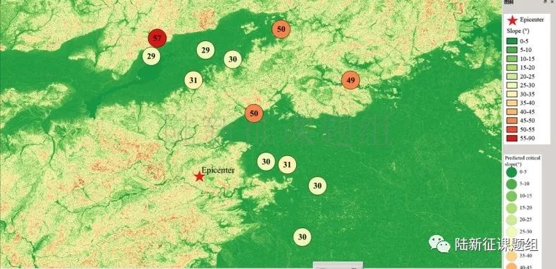 根據(jù)當(dāng)?shù)氐匦螖?shù)據(jù)、巖性數(shù)據(jù)和實(shí)測(cè)地面運(yùn)動(dòng)記錄,可以計(jì)算得到不同滑坡體飽和比例下的滑坡分布,如圖5所示。其中,底圖為當(dāng)?shù)仄露确植紙D,每個(gè)圓圈代表每個(gè)臺(tái)站的計(jì)算結(jié)果,圓圈中的數(shù)字代表發(fā)生滑坡的臨界坡度,臺(tái)站附近坡度大于該數(shù)值的地方滑坡發(fā)生概率高。