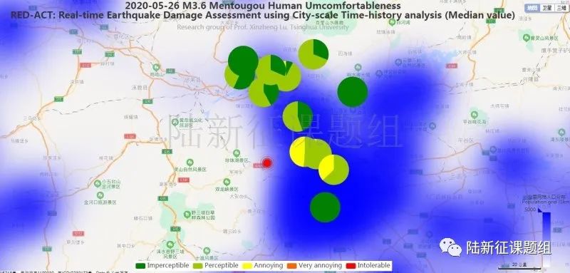 利用密布強(qiáng)震臺(tái)網(wǎng)在震后獲取的實(shí)時(shí)地震動(dòng)信息,再結(jié)合城市抗震彈塑性分析,就可以得到地震發(fā)生后不同地點(diǎn)的建筑破壞情況,為抗震救災(zāi)決策提供科學(xué)支撐。圖3為根據(jù)20200526北京門頭溝區(qū)3.6級(jí)地震震中附近范圍內(nèi)臺(tái)站記錄分析得到的建筑震害分布示意圖。圖4為根據(jù)20200526北京門頭溝區(qū)3.6級(jí)地震震中附近范圍內(nèi)臺(tái)站記錄分析得到的人員加速度感受分布示意圖。