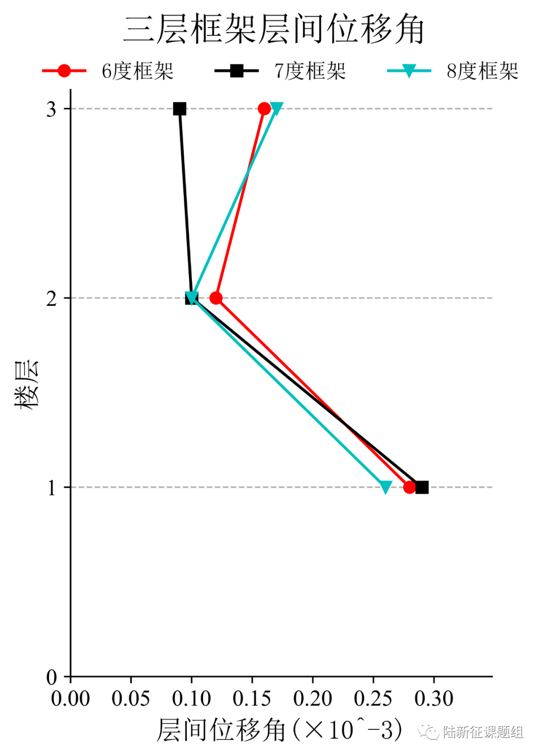將典型臺(tái)站記錄輸入立面布置如圖6 (a)所示的6度、7度和8度設(shè)防的典型三層鋼筋混凝土框架結(jié)構(gòu),得到其層間位移角包絡(luò)如圖6 (b)所示。
