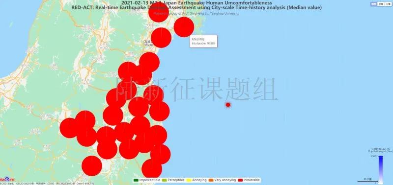 圖4 20210213日本福島縣7.1級(jí)地震不同臺(tái)站地震記錄破壞力分布圖