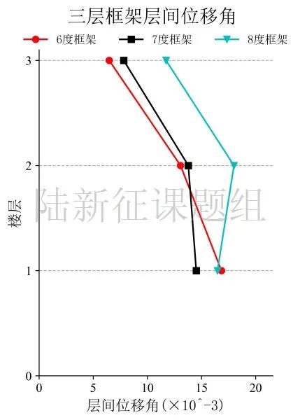 將典型臺(tái)站記錄輸入立面布置如圖7 (a)所示的6度、7度和8度設(shè)防的典型三層鋼筋混凝土框架結(jié)構(gòu),得到其層間位移角包絡(luò)如圖7 (b)所示。