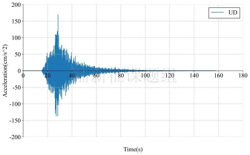 MYG002典型臺站位置北緯38.7262度,東經(jīng)141.511度(圖1,其中紅色標(biāo)記為震中位置),記錄到水平向地震動峰值加速度為546cm/s/s,豎直向地震動峰值加速度為169cm/s/s。該地震動及反應(yīng)譜如圖2、圖3所示。