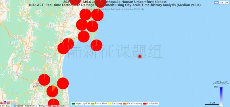 圖5 20210501日本本州東岸近海6.6級地震不同臺站地震記錄人員加速度感受分布圖