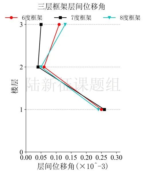 將典型臺站記錄輸入立面布置如圖7 (a)所示的6度、7度和8度設(shè)防的典型三層鋼筋混凝土框架結(jié)構(gòu),得到其層間位移角包絡(luò)如圖7 (b)所示。