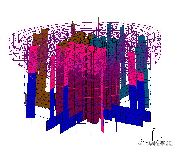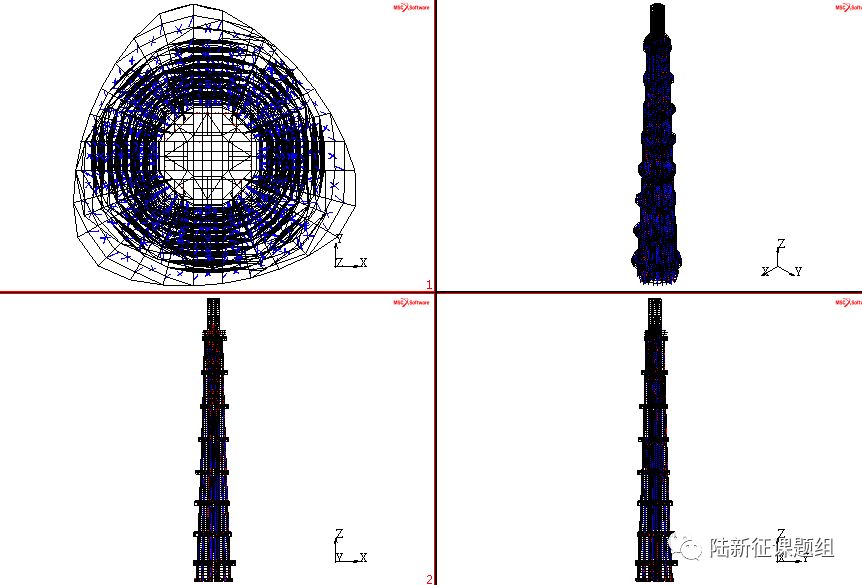具體有限元建模策略為“以非線性計(jì)算性能良好的大型通用有限元程序MSC.Marc 2007為平臺(tái),建立了該超高層建筑的有限元模型。模型中包含的主要單元類型如下:空間梁單元模擬外圍次框架、桁架和塔冠等型鋼構(gòu)件以及剪力墻邊緣構(gòu)件中的型鋼;分層殼單元模擬核心筒中的剪力墻和連梁;空間桿單元模擬連梁上下鐵的縱向鋼筋;膜單元模擬樓板;空間桿單元和分層殼組成的組合模型模擬巨型鋼骨混凝土柱。”(詳見《工程地震災(zāi)變模擬:從高層建筑到城市區(qū)域》,科學(xué)出版社,2015)。