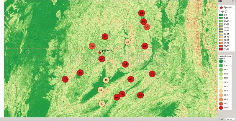根據(jù)當(dāng)?shù)氐匦螖?shù)據(jù)、巖性數(shù)據(jù)和實(shí)測(cè)地面運(yùn)動(dòng)記錄,可以計(jì)算得到不同滑坡體飽和比例下的滑坡分布,如圖6所示。其中,底圖為當(dāng)?shù)仄露确植紙D,每個(gè)圓圈代表每個(gè)臺(tái)站的計(jì)算結(jié)果,圓圈中的數(shù)字代表發(fā)生滑坡的臨界坡度,臺(tái)站附近坡度大于該數(shù)值的地方滑坡發(fā)生概率高。