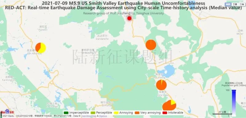 圖5 20210708美國(guó)內(nèi)華達(dá)州5.9級(jí)地震不同臺(tái)站地震記錄人員加速度感受分布圖