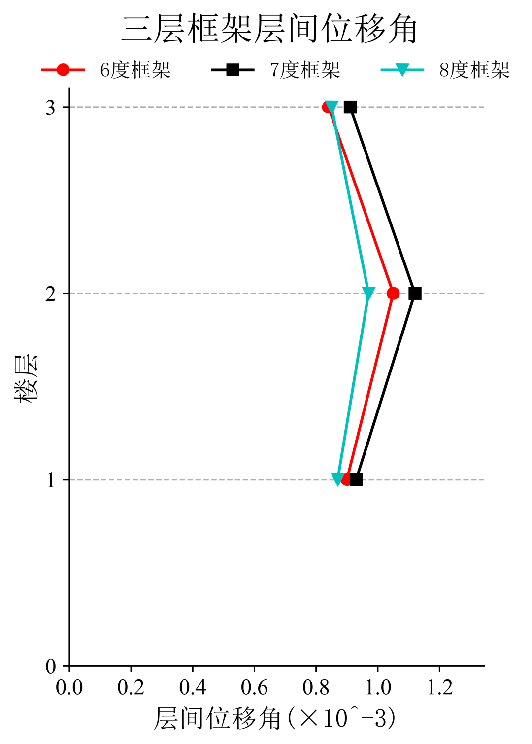 將典型臺(tái)站記錄輸入立面布置如圖6(a)所示的6度、7度和8度設(shè)防的典型三層鋼筋混凝土框架結(jié)構(gòu),得到其層間位移角包絡(luò)如圖6(b)所示。