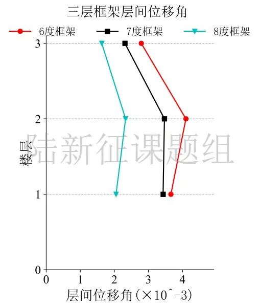 將典型臺站記錄輸入立面布置如圖4(a)所示的6度、7度和8度設(shè)防的典型三層鋼筋混凝土框架結(jié)構(gòu),得到其層間位移角包絡(luò)如圖4(b)所示。