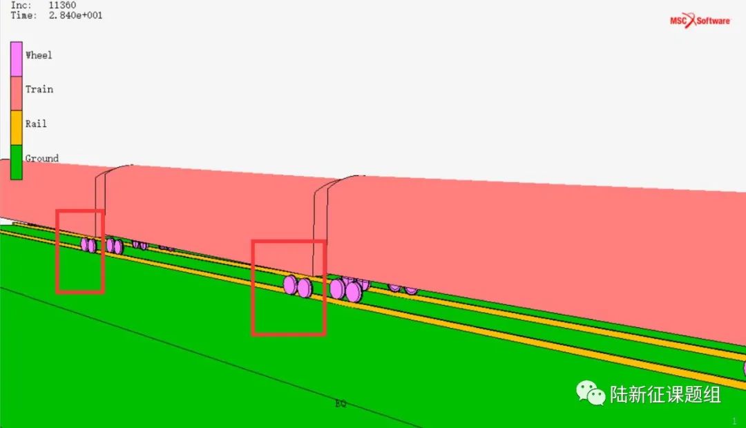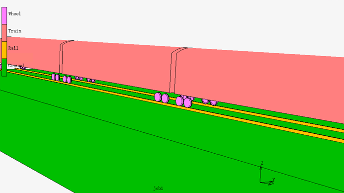 根據(jù)資料,列車(chē)并非在高速運(yùn)行時(shí)發(fā)生了脫軌,而是在“幾乎停止”的情況下發(fā)生了脫軌。因此本文為了簡(jiǎn)化起見(jiàn),計(jì)算列車(chē)在靜止?fàn)顟B(tài)下受地震作用的響應(yīng)。本文基于MSC.MARC通用有限元軟件,建立了一個(gè)簡(jiǎn)化的列車(chē)模型(圖2),在列車(chē)靜止?fàn)顟B(tài)開(kāi)始動(dòng)力工況模擬。