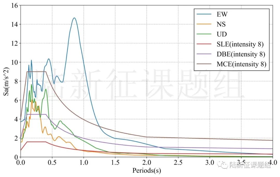 SC.T2601典型臺站位置北緯30.38度,東經(jīng)103.01度,記錄到水平向地震動峰值加速度為377cm/s/s,豎直向地震動峰值加速度為189cm/s/s。該地震動及反應(yīng)譜如圖1、圖2所示。另外SC.T2671記錄到1282cm/s/s的加速度,但是中長周期反應(yīng)譜強(qiáng)度不及SC.T2601。