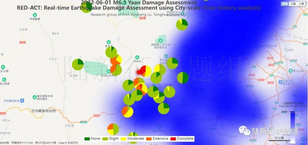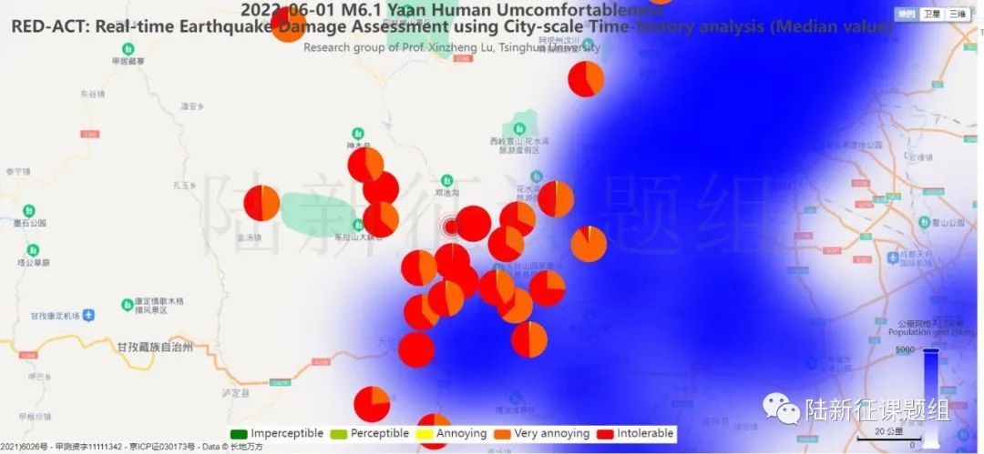 根據(jù)中國地震學(xué)會標(biāo)準(zhǔn)《基于強(qiáng)震動記錄的地震破壞力評估T/SSC 1—2021》(參閱新標(biāo)準(zhǔn)發(fā)布 :基于強(qiáng)震動記錄的地震破壞力評估),利用密布強(qiáng)震臺網(wǎng)在震后獲取的實(shí)時(shí)地震動信息,再結(jié)合城市抗震彈塑性分析,就可以得到地震發(fā)生后不同地點(diǎn)的建筑破壞情況,為抗震救災(zāi)決策提供科學(xué)支撐。圖3為根據(jù)本次地震震中附近范圍內(nèi)臺站記錄分析得到的建筑震害分布示意圖。圖4為根據(jù)本次地震震中附近范圍內(nèi)臺站記錄分析得到的人員加速度感受分布示意圖。