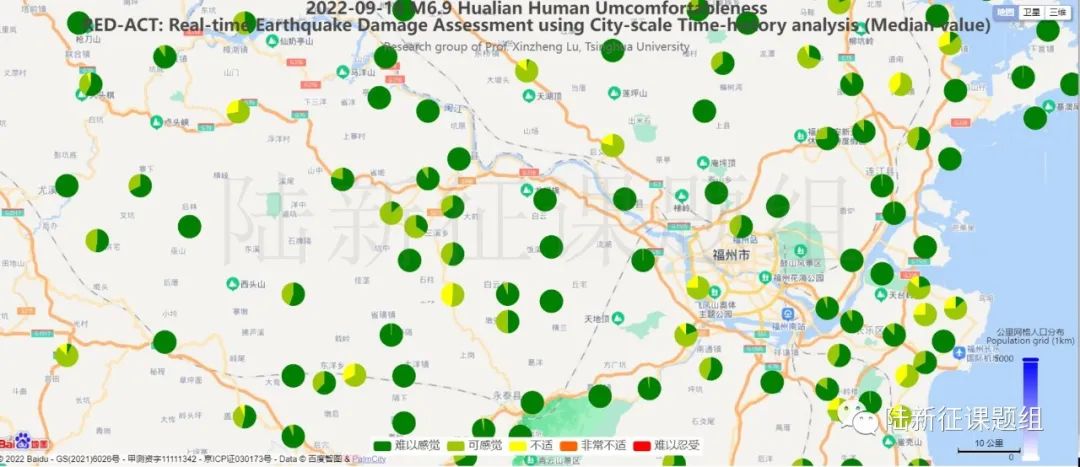 從圖2可以清晰看出,雖然本次地震不會(huì)在大陸地區(qū)引起什么破壞,但是地面加速度造成的人員不適的比例較高。在福州等地,感到“不適”的比例可以接近50%。所以當(dāng)?shù)孛癖姼杏X(jué)震感強(qiáng)烈是完全合情合理的。本案例也進(jìn)一步說(shuō)明了城市抗震彈塑性分析的優(yōu)點(diǎn)。