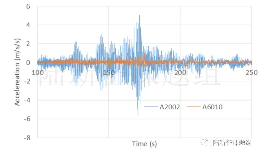 如果我們將兩個(gè)臺(tái)站的地震動(dòng)放在一起對(duì)比,就會(huì)發(fā)現(xiàn),A2002臺(tái)站的地震動(dòng)顯著強(qiáng)于A6010臺(tái)站(圖8)。至于為什么會(huì)有這樣的現(xiàn)象,是因?yàn)閳?chǎng)地問(wèn)題還是因?yàn)榈匦螁?wèn)題,這個(gè)還有待進(jìn)一步研究。