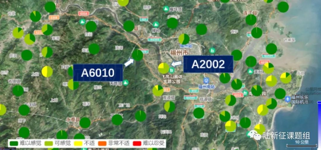 我們可以進(jìn)一步選取兩個(gè)典型臺(tái)站對(duì)比。A2002臺(tái)站和A6010臺(tái)站距離很近,直線(xiàn)距離約10km(圖7)。但是,二者的感受差異非常顯著。