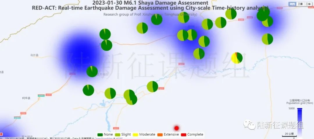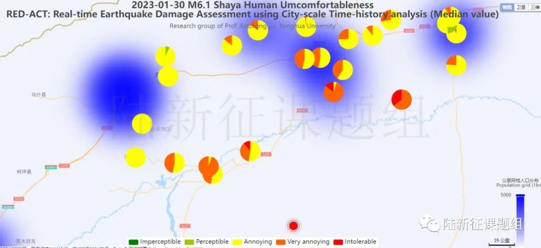 根據(jù)中國地震學(xué)會(huì)標(biāo)準(zhǔn)《基于強(qiáng)震動(dòng)記錄的地震破壞力評(píng)估T/SSC 1—2021》(參閱新標(biāo)準(zhǔn)發(fā)布 :基于強(qiáng)震動(dòng)記錄的地震破壞力評(píng)估),利用密布強(qiáng)震臺(tái)網(wǎng)在震后獲取的實(shí)時(shí)地震動(dòng)信息,再結(jié)合城市抗震彈塑性分析,就可以得到地震發(fā)生后不同地點(diǎn)的建筑破壞情況,為抗震救災(zāi)決策提供科學(xué)支撐。圖3為根據(jù)本次地震震中附近范圍內(nèi)臺(tái)站記錄分析得到的建筑震害分布示意圖。圖4為根據(jù)本次地震震中附近范圍內(nèi)臺(tái)站記錄分析得到的人員加速度感受分布示意圖。