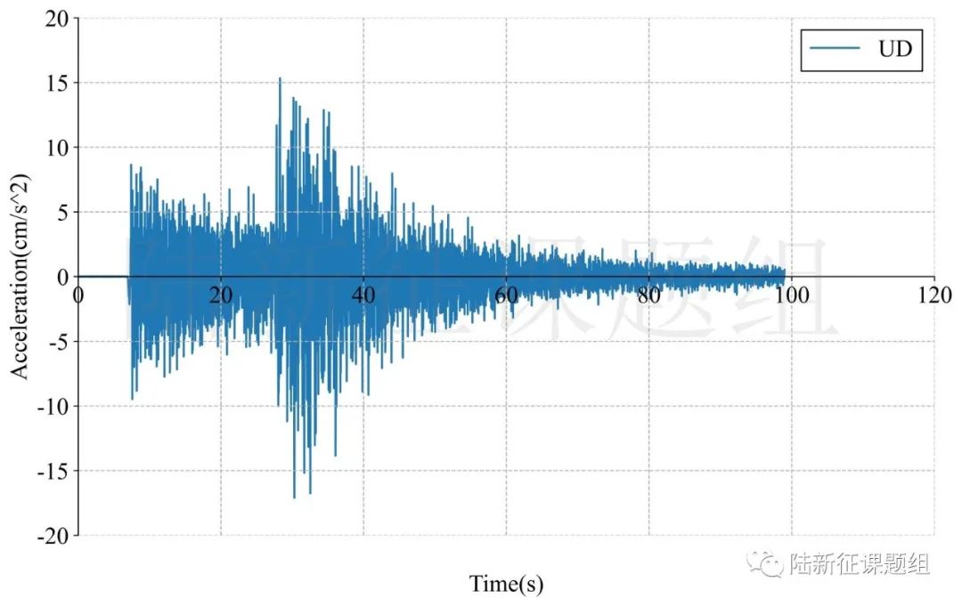 XJ.NK005典型臺(tái)站位置北緯41.17度,東經(jīng)83.59度,記錄到水平向地震動(dòng)峰值加速度為91.4cm/s/s,豎直向地震動(dòng)峰值加速度為17.1cm/s/s。該地震動(dòng)及反應(yīng)譜如圖1、圖2所示。