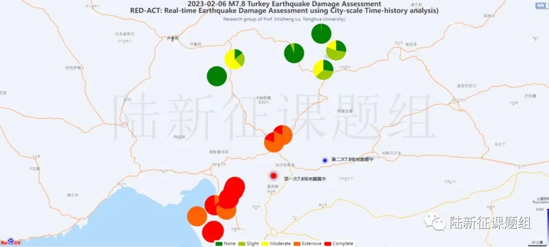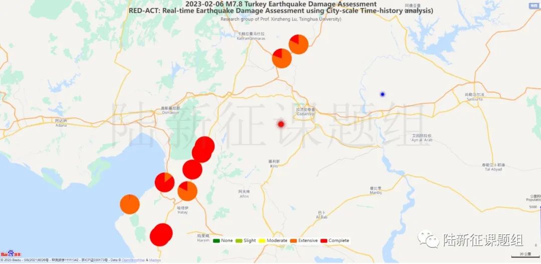 從圖4、5可見,在地圖南側(cè)的震害是非常嚴(yán)重的,大部分建筑都進(jìn)入了倒塌或者嚴(yán)重破壞的狀態(tài)(紅色或橙色)。這里肯定有讀者會(huì)問:圖4只是一次7.8級(jí)地震引起的破壞,北側(cè)藍(lán)點(diǎn)(第二次7.8級(jí)地震震中)附近在第二次7.8級(jí)地震后肯定會(huì)遭到很嚴(yán)重的破壞啊!確實(shí),第二次7.8級(jí)地震發(fā)生后,建筑震害肯定會(huì)進(jìn)一步的變化。但是這種破壞肯定和直接遭受一次7.8級(jí)地震作用的結(jié)果不一樣。因?yàn)榈谝淮蔚卣鹨呀?jīng)引起了破壞,第二次地震再來,建筑的破壞會(huì)進(jìn)一步發(fā)展,而兩次地震疊加會(huì)使得問題更加復(fù)雜。那兩次地震疊加后的區(qū)域建筑震害該怎么分析呢?不急,我們有專門研究,請(qǐng)聽下回分解。今天我們只討論第一次7.8級(jí)地震的影響。