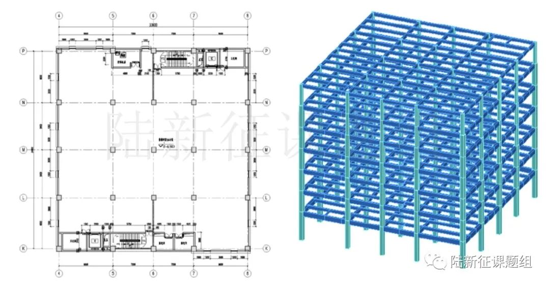 那中國的建筑有可能頂住這次地震的地面運(yùn)動(dòng)么?正好課題組此前積累了不少建筑分析模型,于是我們就把這次土耳其地震的地震動(dòng)輸入進(jìn)去分析了一下。(1) 鋼筋混凝土框架結(jié)構(gòu)華東院、北京院曾經(jīng)設(shè)計(jì)了一個(gè)7層鋼筋混凝土框架,設(shè)計(jì)條件為8度設(shè)防,三類場(chǎng)地,用于中美抗震規(guī)范設(shè)計(jì)結(jié)果對(duì)比(圖6)。我們課題組張弛同學(xué)建立了其非線性有限元模型,結(jié)構(gòu)一階周期約為1.3-1.4s。