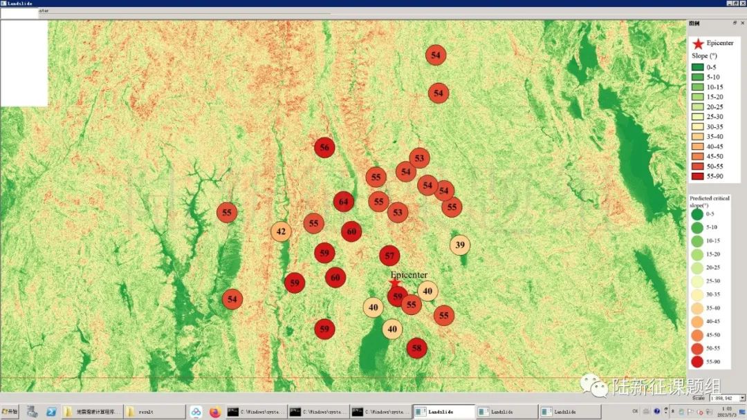 根據(jù)當(dāng)?shù)氐匦螖?shù)據(jù)、巖性數(shù)據(jù)和實(shí)測地面運(yùn)動記錄,可以計(jì)算得到不同滑坡體飽和比例下的滑坡分布,如圖5所示。其中,底圖為當(dāng)?shù)仄露确植紙D,每個(gè)圓圈代表每個(gè)臺站的計(jì)算結(jié)果,圓圈中的數(shù)字代表發(fā)生滑坡的臨界坡度,臺站附近坡度大于該數(shù)值的地方滑坡發(fā)生概率高。