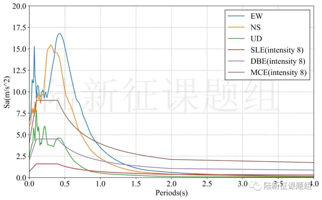 YN.ML003典型臺站位置北緯25.45度,東經(jīng)99.26度,記錄到水平向地震動峰值加速度為684cm/s/s,豎直向地震動峰值加速度為296cm/s/s。該地震動及反應(yīng)譜如圖1、圖2所示。