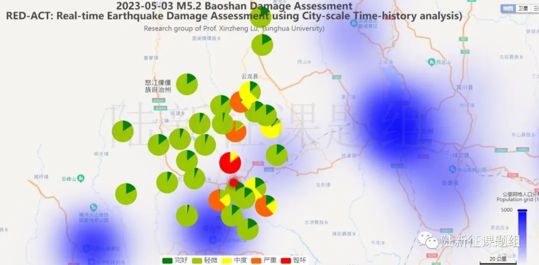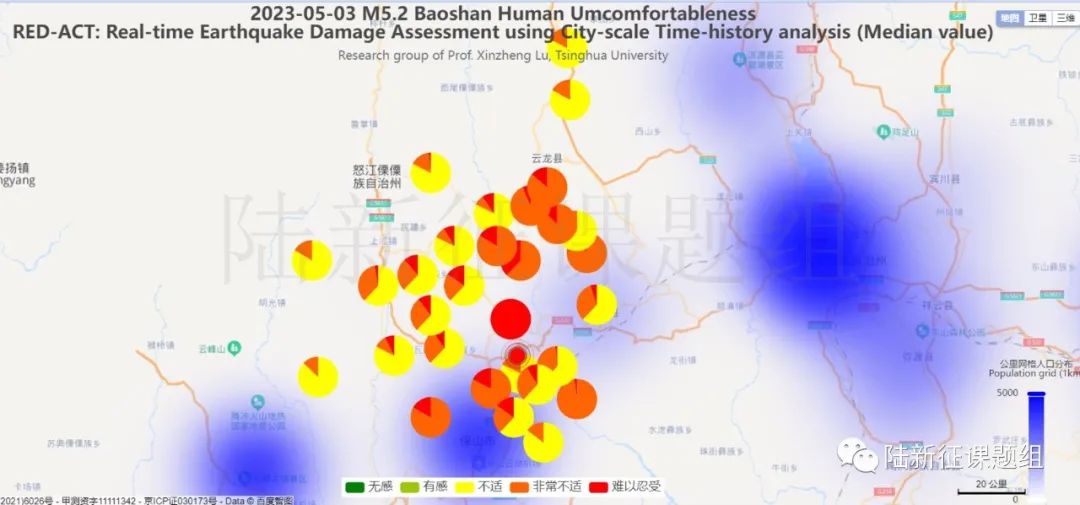 根據(jù)中國地震學(xué)會標(biāo)準(zhǔn)《基于強(qiáng)震動記錄的地震破壞力評估T/SSC 1—2021》(參閱新標(biāo)準(zhǔn)發(fā)布 :基于強(qiáng)震動記錄的地震破壞力評估),利用密布強(qiáng)震臺網(wǎng)在震后獲取的實(shí)時(shí)地震動信息,再結(jié)合城市抗震彈塑性分析,就可以得到地震發(fā)生后不同地點(diǎn)的建筑破壞情況,為抗震救災(zāi)決策提供科學(xué)支撐。圖3為根據(jù)本次地震震中附近范圍內(nèi)臺站記錄分析得到的建筑震害分布示意圖。圖4為根據(jù)本次地震震中附近范圍內(nèi)臺站記錄分析得到的人員加速度感受分布示意圖。