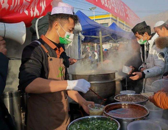 8點(diǎn)多,太陽升起,伴著暖洋洋的陽光,“頭鍋”開了。馬班吉的伙計(jì)嫻熟地舀起一碗面湯,撒下一把面條,牛肉塊、香菜碎,再加上一勺辣子,第一碗冒著熱氣和香氣的牛肉面遞到村民面前。